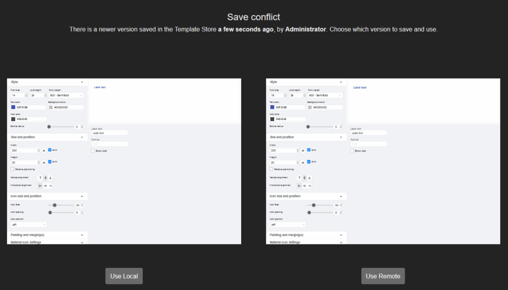 prompt so that users of the same ThingWorx instance can avoid stepping on each other’s toes. This will show users that since they opened the Configurator and edited a Template if somebody else has been modifying the same Template and saved it.