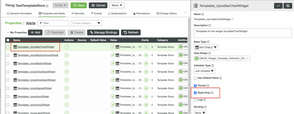To ensure that developers do not select the company-widget Template Store Thing as their Template store in the mashups, is properties can be marked as read only. The Configurator will show all templates originating from readonly properties as not editable.