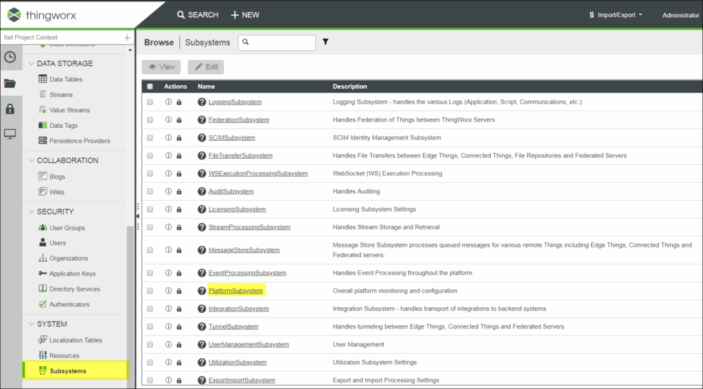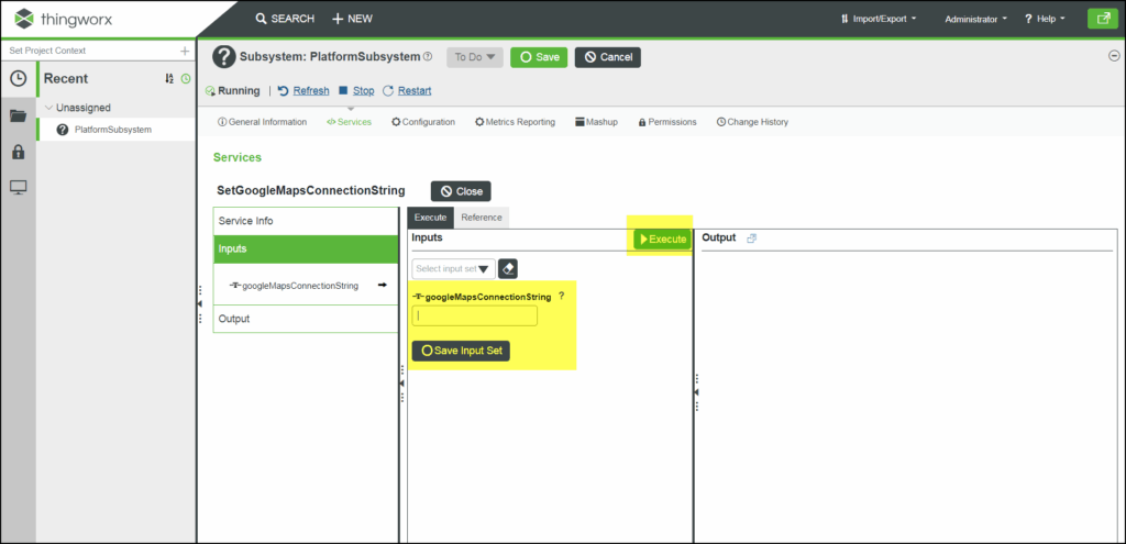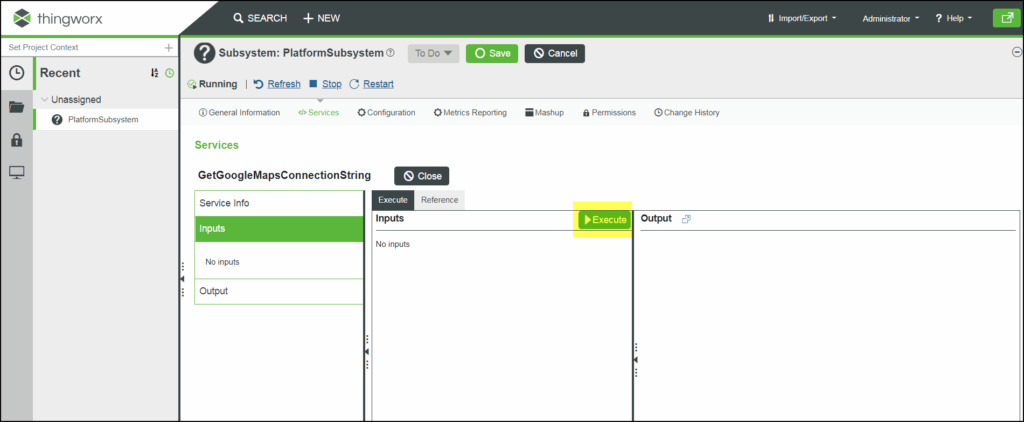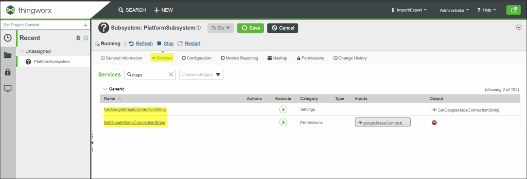 2. Search and locate GetGoogleMapConnectionString and SetGoogleMapConnectionString. In the ThingWorx Composer, navigate to Subsystem > PlatformSubsystem > Services.