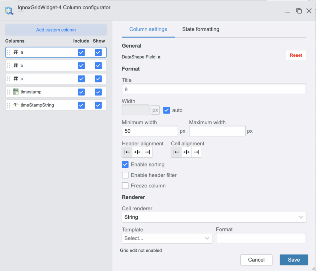 AllowEdit | BOOLEAN | < | Enable/Disable grid edit options from column Configurator. | |