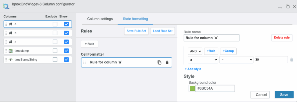 ColumnsRuleSet | JSON | < | The rule set for columns state formatter. This is not expected to be changed manually, column Configurator should be used instead. | |