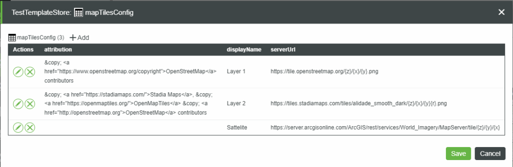 To add new tile providers on a Template Store, open the Template Store Thing and click on the edit button for the mapTilesConfig
