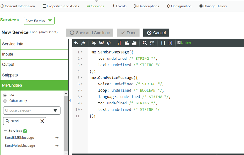 If new services are created in the Twilio Thing, they can be called in a custom service from the Me/Entities service editor area.